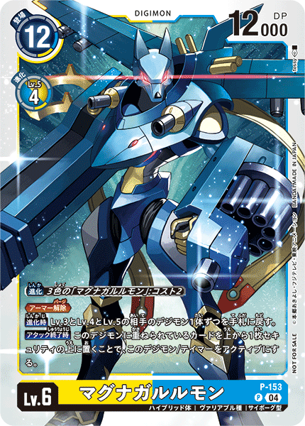 Lv.6 マグナガルルモン P-153 P ハイブリッド体 | ヴァリアブル種 | サイボーグ型 ≪アーマー解除≫ 【進化時】Lv.3とLv.4とLv.5の相手のデジモン1体ずつを手札に戻す。 【アタック終了時】このデジモンに重ねられているカードを上から1枚セキュリティの上に置くことで、このデジモン/テイマーをアクティブにする。 ---