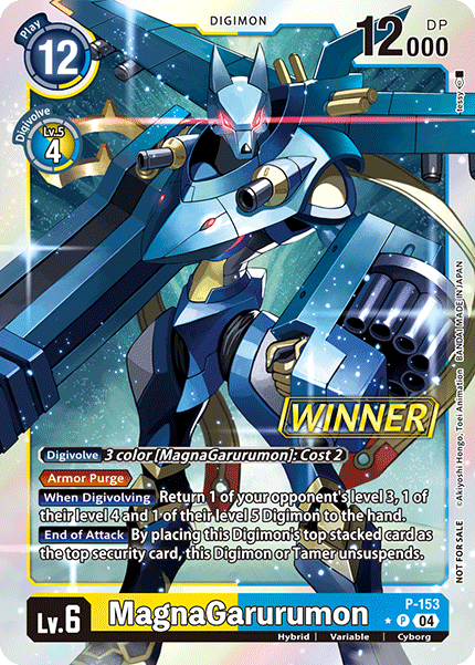Lv.6 MagnaGarurumon P-153 P Hybrid | Variable | Cyborg [Digivolve] 3 color [MagnaGarurumon]: Cost 2 <Armor Purge> [When Digivolving] Return 1 of your opponent's level 3, 1 of their level 4 and 1 of their level 5 Digimon to the hand. [End of Attack] By placing this Digimon's top stacked card as your top security card, this Digimon or Tamer unsuspends. --- -