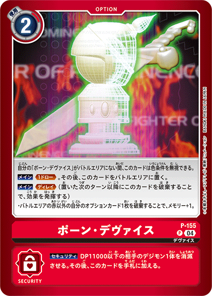 ポーン• デヴァイス P-155 P デヴァイス 自分の「ポーン• デヴァイス」がバトルエリアにない間、このカードは色条件を無視できる。 【メイン】≪1ドロー≫。その後、このカードをバトルエリアに置く。 【メイン】≪ディレイ≫(置いた次のターン以降にこのカードを破棄することで、効果を発揮する) • バトルエリアの赤以外の自分のオプションカード1枚を破棄することで、メモリー+1。 --- 【セキュリティ】DP11000以下の相手のデジモン1体を消滅させる。その後、このカードを手札に加える。