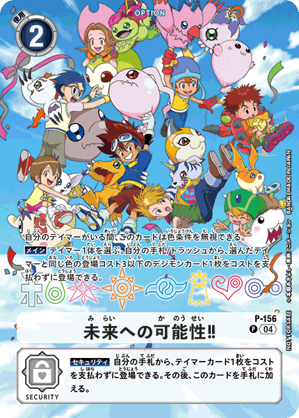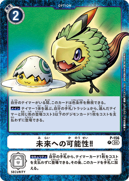 未来への可能性!! P-156 P 自分のテイマーがいる間、このカードは色条件を無視できる。 【メイン】テイマー1体を選ぶ。自分の手札/トラッシュから、選んだテイマーと同じ色の登場コスト3以下のデジモンカード1枚をコストを支払わずに登場できる。 --- 【セキュリティ】自分の手札から、テイマーカード1枚をコストを支払わずに登場できる。その後、このカードを手札に加える。