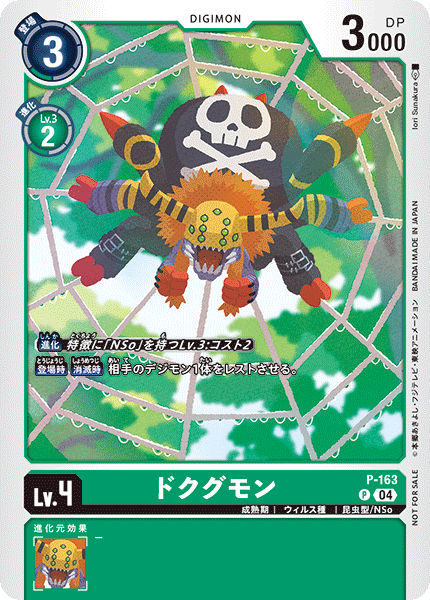 Lv.4 ドクグモン P-163 P 成熟期 | ウィルス種 | 昆虫型/NSo 【登場時】【消滅時】相手のデジモン1体をレストさせる。 ---