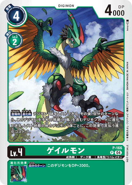 Lv.4 ゲイルモン P-166 P 成熟期 | データ種 | 鳥竜型/リベレイター 【登場時】【進化時】デジモン1体をレストできる。その後、自分のターンなら、このデジモンを手札の特徴に「鳥」を含むデジモンカードに進化できる。レスト状態の他のデジモン1体ごとに、この効果で支払う進化コスト-1。 --- 【自分のターン】このデジモンをDP+2000。