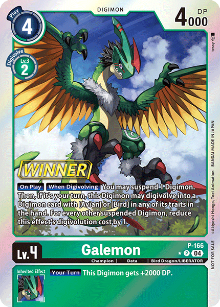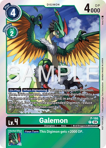 Lv.4 Galemon P-166 P champion | Data | Bird Dragon/LIBERATOR [On Play] [When Digivolving] You may suspend 1 Digimon. Then, if it's your turn, this Digimon may digivolve into a Digimon card with [Bird] or [Avian] in any of its traits in the hand. For every other suspended Digimon, reduce this effect's digivolution cost by 1. --- [Your Turn] This Digimon gets +2000 DP.