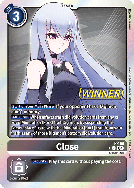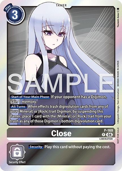 クローズ P-169 P リベレイター 【自分のメインフェイズ開始時】相手のデジモンがいるなら、メモリー+1。 【お互いのターン】特徴に「鉱物型」/「鉱石型」を持つ自分のデジモンの進化元が効果で破棄されたとき、このテイマーをレストさせることで、自分のトラッシュから、特徴に「鉱物型」/「鉱石型」を持つカード1枚をそのデジモンの進化元の下に置く。 --- 【セキュリティ】このカードをコストを支払わずに登場させる。
