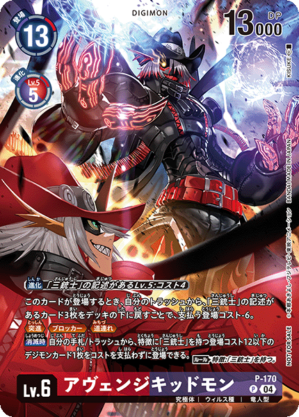 Lv.6 アヴェンジキッドモン P-170 P 究極体 | ウィルス種 | 竜人型 このカードが登場するとき、自分のトラッシュから、「三銃士」の記述があるカード3枚をデッキの下に戻すことで、支払う登場コスト-6。 ≪突進≫≪ブロッカー≫≪道連れ≫ 【消滅時】自分の手札/トラッシュから、特徴に「三銃士」を持つ登場コスト12以下のデジモンカード1枚をコストを支払わずに登場できる。 〈ルール〉特徴:「三銃士」を持つ。 ---