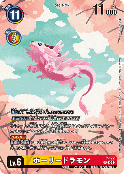 [On Play] [On Deletion] 1 of your opponent's Digimon gets -5000 DP for the turn. Then, delete 1 of their Digimon with 5000 DP or less.Lv.6 ホーリードラモン P-172 P 究極体 | ワクチン種 | 聖竜型/四大竜/NSp このカードが登場するとき、自分の表向きのセキュリティに「ネイチャースピリッツ」があるなら、支払う登場コスト-4。 ≪ブロッカー≫ 【登場時】【消滅時】ターン終了まで、相手のデジモン1体をDP-5000。その後、DP5000以下の相手のデジモン1体を消滅させる。 ---