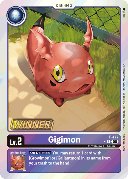 Lv.2 Gigimon P-177 P in-training | Lesser --- [On Deletion] You may return 1 card with [Growlmon] or [Gallantmon] in its name from your trash to the hand.