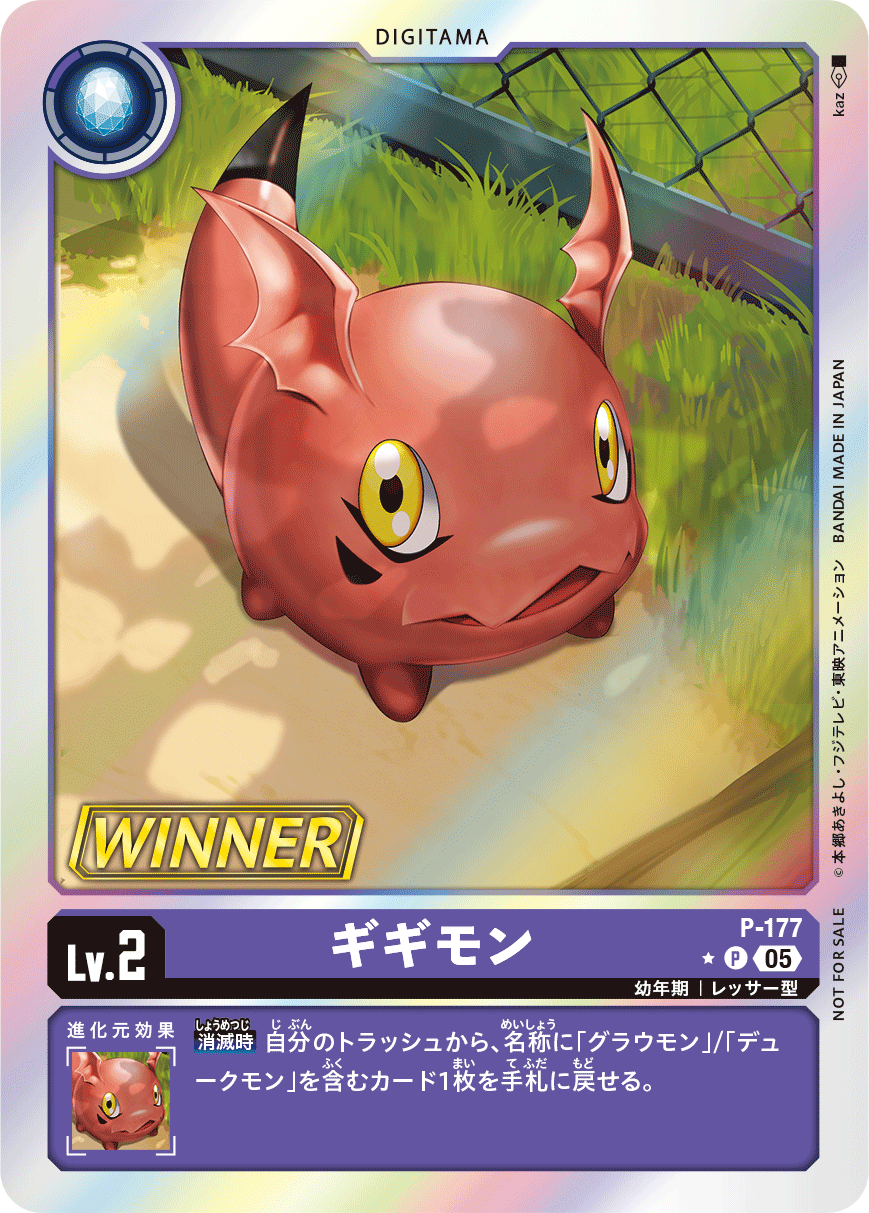 Lv.2 ギギモン P-177 P 幼年期 | レッサー型 --- 【消滅時】自分のトラッシュから、名称に「グラウモン」/「デュークモン」を含むカード1枚を手札に戻せる。