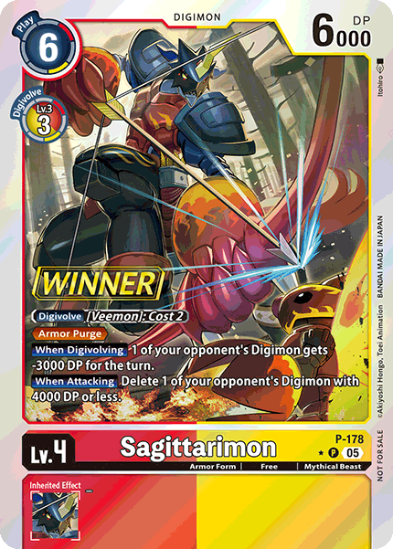 Lv.4 Sagittarimon P-178 P Armor Form | Free | Mythical Beast <Armor Purge> [When Digivolving] 1 of your opponent's Digimon gets -3000 DP for the turn. [When Attacking] Delete 1 of your opponent's Digimon with 4000 DP or less. ---