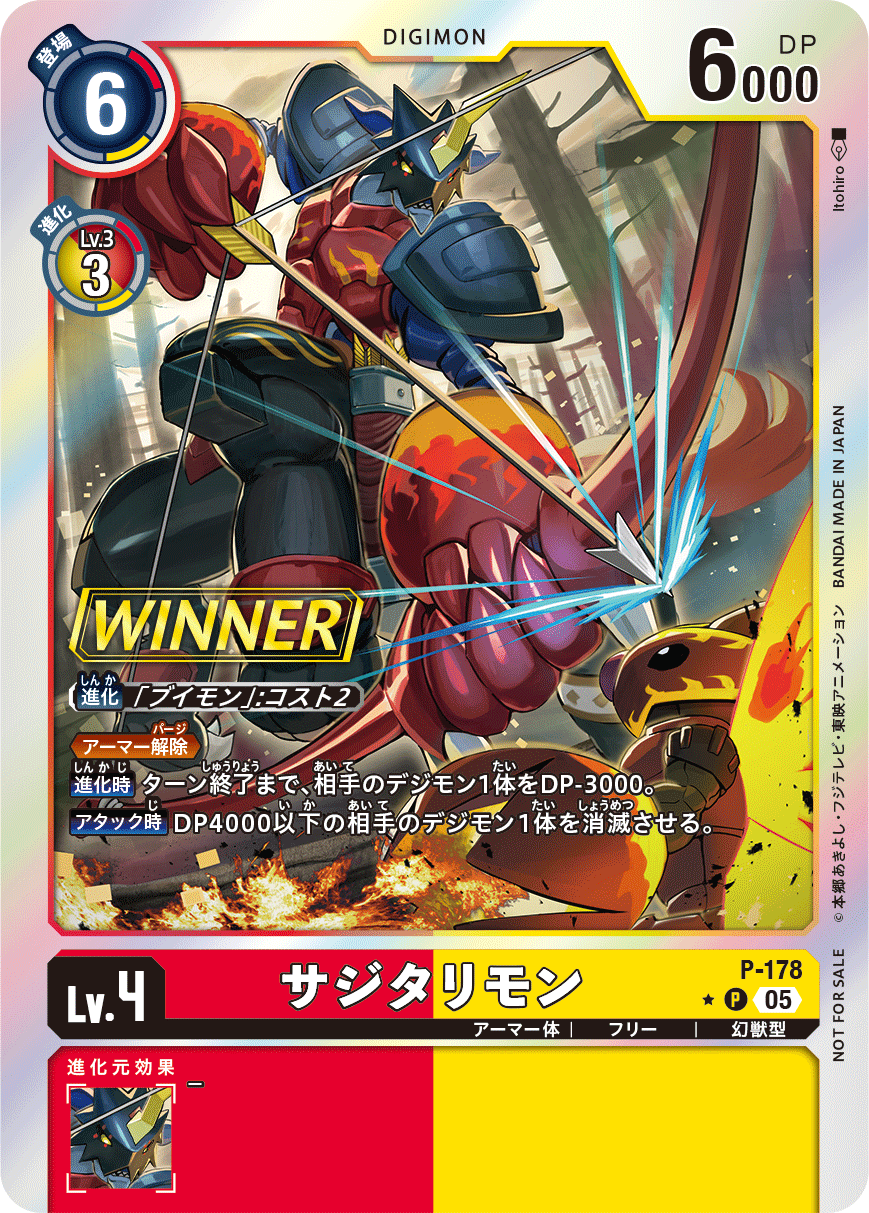 Lv.4 サジタリモン P-178 P アーマー体 | フリー | 幻獣型 ≪アーマー解除≫ 【進化時】ターン終了まで、相手のデジモン1体をDP-3000。 【アタック時】DP4000以下の相手のデジモン1体を消滅させる。 ---