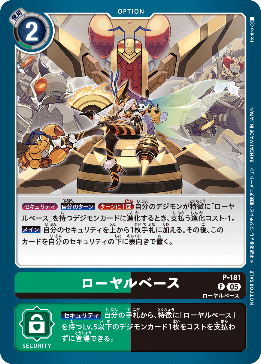 {セキュリティ}【自分のターン】[ターンに1回]自分のデジモンが特徴に「ローヤルベース」を持つデジモンカードに進化するとき、支払う進化コスト-1。