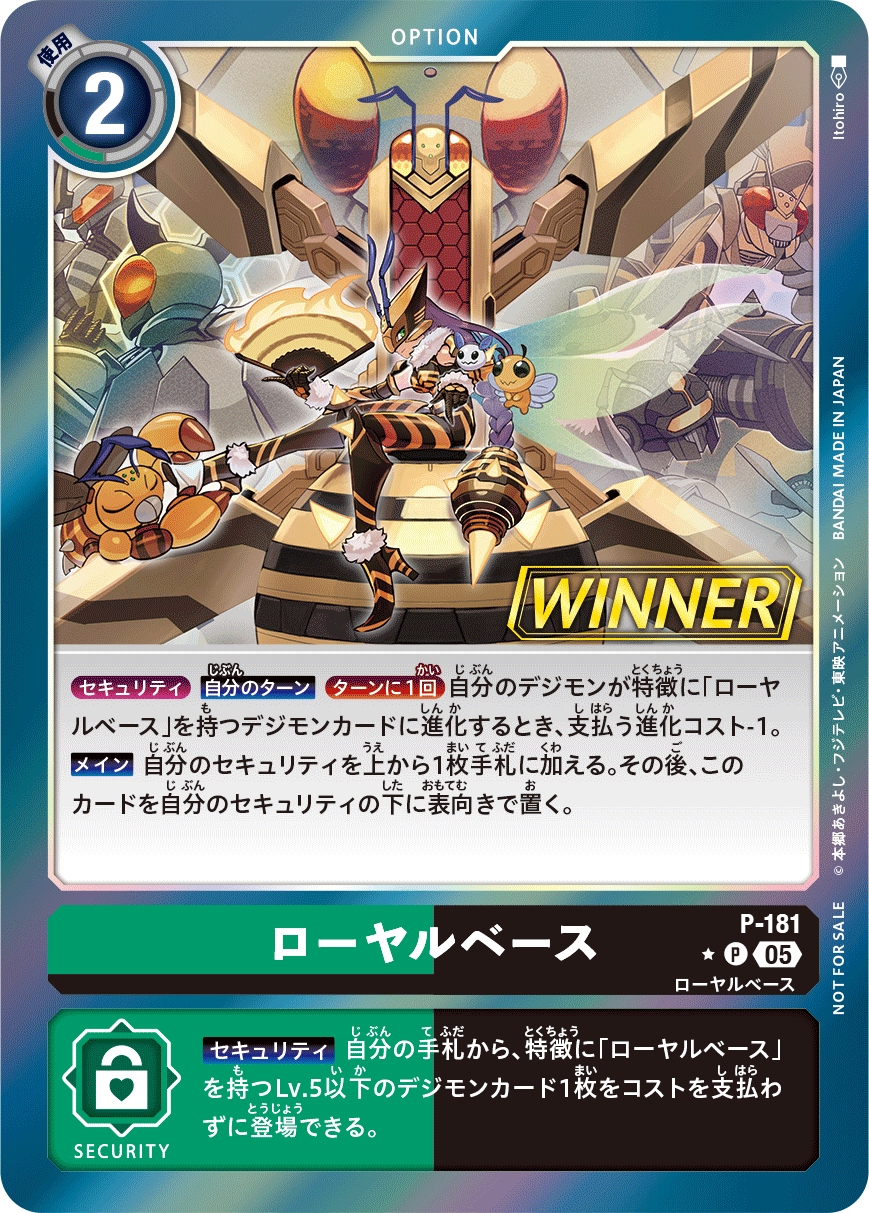 【セキュリティ】自分の手札から、特徴に「ローヤルベース」を持つLv.5以下のデジモンカード1枚をコストを支払わずに登場できる。