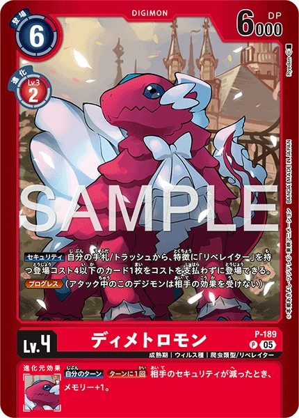 Lv.4 ディメトロモン P-189 P 成熟期 | ウィルス種 | 爬虫類型/リベレイター 【セキュリティ】自分の手札/トラッシュから、特徴に「リベレイター」を持つ登場コスト4以下のカード1枚をコストを支払わずに登場できる。 ≪プログレス≫(アタック中のこのデジモンは相手の効果を受けない) --- 【自分のターン】[ターンに1回]相手のセキュリティが減ったとき、メモリー+1。
