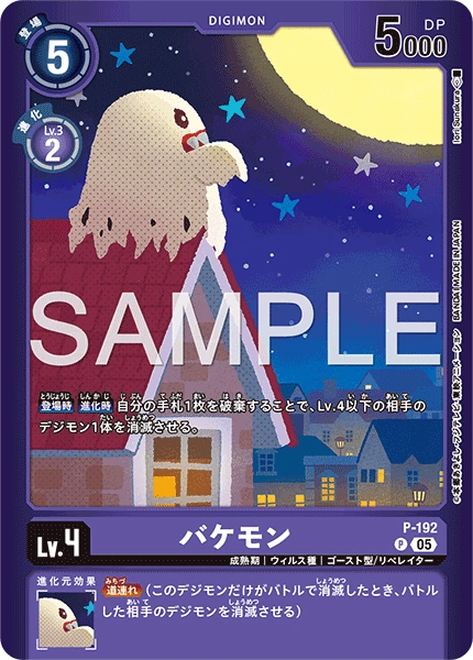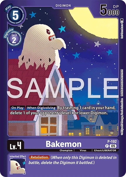 Lv.4 Bakemon P-192 P Champion | Virus | Ghost/LIBERATOR [On Play] [When Digivolving] By trashing 1 card in your hand, delete 1 of your opponent's level 4 or lower Digimon. --- <Retaliation> (When only this Digimon is deleted in battle, delete the Digimon it battled.)