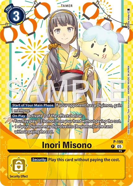 Inori Misono P-195 P TS [Start of Your Main Phase] If your opponent has a Digimon, gain 1 memory. [On Play] Activate 1 of the effects below: • You may play 1 [Elecmon] from your hand without paying the cost. • 1 of your Digimon may digivolve into [Aegiomon] in the hand without paying the cost. --- [Security] Play this card without paying the cost.
