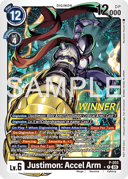 Lv.6 Justimon: Accel Arm P-203 P Mega | Vaccine | Cyborg [Digivolve] [Justimon: Blitz Arm]/[Justimon: Critical Arm]: Cost 1 [Digivolve] Lv.5 w/[Cyberdramon] in name: Cost 3 [On Play] [When Digivolving] [When Attacking] [Once Per Turn] <De-Digivolve 1> 1 of your opponent's Digimon. Then, by trashing 1 Option card in the battle area, this Digimon gains <Piercing> and <Security A. +1> for the turn. [All Turns] [Once Per Turn] When Option cards in the battle area are trashed, 1 of your opponent's Digimon can't digivolve or attack players until their turn ends. --- -