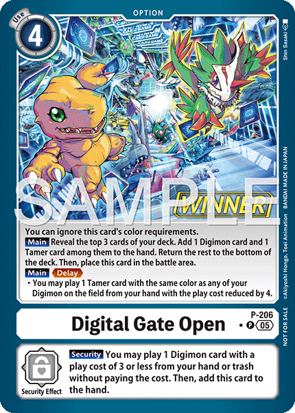 Digital Gate Open P-206 P You can ignore this card's color requirements. [Main] Reveal the top 3 cards of your deck. Add 1 Digimon card and 1 Tamer card among them to the hand. Return the rest to the bottom of the deck. Then, place this card in the battle area. [Main] <Delay> • You may play 1 Tamer card with the same color as any of your Digimon on the field from your hand with the play cost reduced by 4. --- [Security] You may play 1 Digimon card with a play cost of 3 or less from your hand or trash without paying the cost. Then, add this card to the hand.