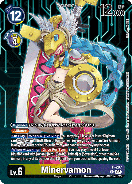 Lv.6 Minervamon P-207 P Mega | Virus | Shaman/Olympos XII/Iliad/TS [Digivolve] Lv.5 w/[Beastkin]/[TS] trait: Cost 3 <Alliance> [On Play] [When Digivolving] You may play 1 level 4 or lower Digimon card with [Avian], [Bird], [Beast], [Animal] or [Sovereign], other than [Sea Animal], in any of its traits or the [TS] trait from your hand without paying the cost. [When Attacking] [Once Per Turn] You may play 1 level 4 or lower Digimon card with [Avian], [Bird], [Beast], [Animal] or [Sovereign], other than [Sea Animal], in any of its traits or the [TS] trait from your trash without paying the cost. --- -
