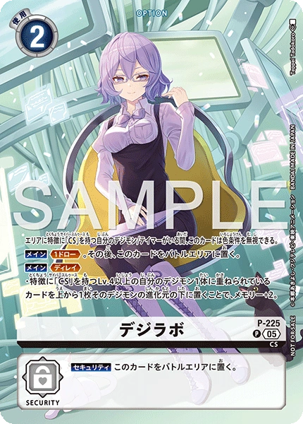 デジラボ P-225 P CS エリアに特徴に「CS」を持つ自分のデジモン/テイマーがいる間、このカードは色条件を無視できる。 【メイン】≪1ドロー≫。その後、このカードをバトルエリアに置く。 【メイン】≪ディレイ≫ • 特徴に「CS」を持つLv.4以上の自分のデジモン1体に重ねられているカードを上から1枚そのデジモンの進化元の下に置くことで、メモリー+2。 --- 【セキュリティ】このカードをバトルエリアに置く。