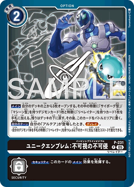 Unique Emblem: Invincibly Invisible P-231 P LIBERATOR [Main] Reveal the top 3 cards of your deck. Add 1 [Cyborg] or [Machine] trait Digimon card and 1 [LIBERATOR] trait card among them to the hand. Return the rest to the bottom of the deck. Then, place this card in the battle area. [Your Turn] When any of your [Altea]s are played, <Delay> • 1 of your Digimon may digivolve into a level 6 or lower [LIBERATOR] trait card in the hand with the digivolution cost reduced by 3. --- [Security] Activate this card's [Main] effect.