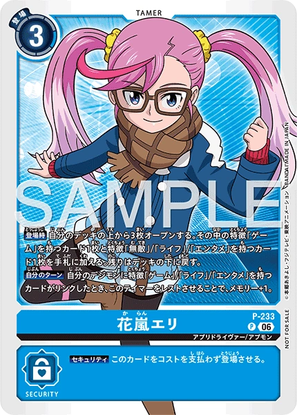 花嵐エリ P-233 P アプリドライヴァー/アプモン 【登場時】自分のデッキの上から3枚オープンする。その中の特徴「ゲーム」を持つカード1枚と特徴「無敵」/「ライフ」/「エンタメ」を持つカード1枚を手札に加える。残りはデッキの下に戻す。 【自分のターン】自分のデジモンに特徴「ゲーム」/「ライフ」/「エンタメ」を持つカードがリンクしたとき、このテイマーをレストさせることで、メモリー+1。 --- 【セキュリティ】このカードをコストを支払わず登場させる。