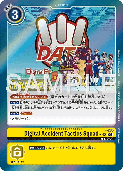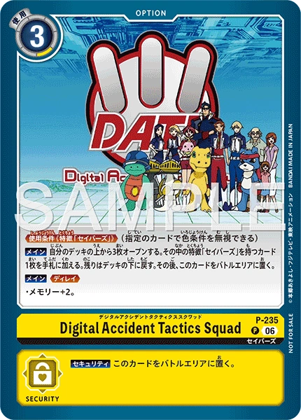 Digital Accident Tactics Squad P-235 P DATA SQUAD <Use Req. ([DATA SQUAD] trait)> (Specified cards let you ignore color requirements.) [Main] Reveal the top 3 cards of your deck. Add 1 card with the [DATA SQUAD] trait among them to the hand. Return the rest to the bottom of the deck. Then, place this card in the battle area. [Main] <Delay> • Gain 2 memory. --- [Security] Place this card in the battle area.