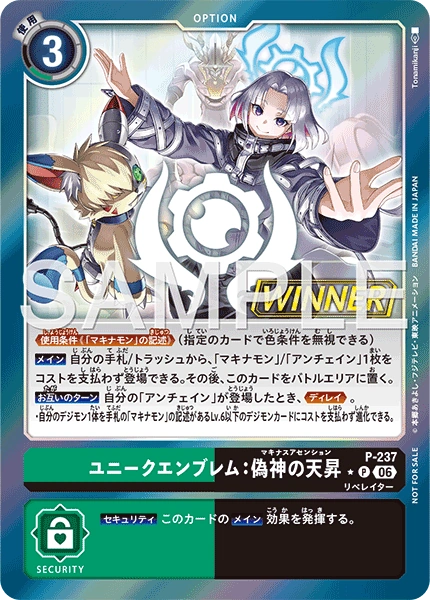 [Security] Activate this card's [Main] effect.ユニークエンブレム:偽神の天昇 P-237 P リベレイター ≪使用条件《「マキナモン」の記述》≫(指定のカードで色条件を無視できる) 【メイン】自分の手札/トラッシュから、「マキナモン」/「アンチェイン」1枚をコストを支払わず登場できる。その後、このカードをバトルエリアに置く。 【お互いのターン】自分の「アンチェイン」が登場したとき、≪ディレイ≫。 • 自分のデジモン1体を手札の「マキナモン」の記述があるLv.6以下のデジモンカードにコストを支払わず進化できる。 --- 【セキュリティ】このカードの【メイン】効果を発揮する。