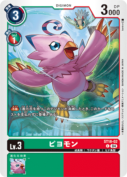 Lv.3 ピヨモン ST18-02 C 成長期 | ワクチン種 | ヒナ鳥型 ≪不屈≫(進化元を持つこのデジモンが消滅したとき、このカードをコストを支払わずに登場させる) ---