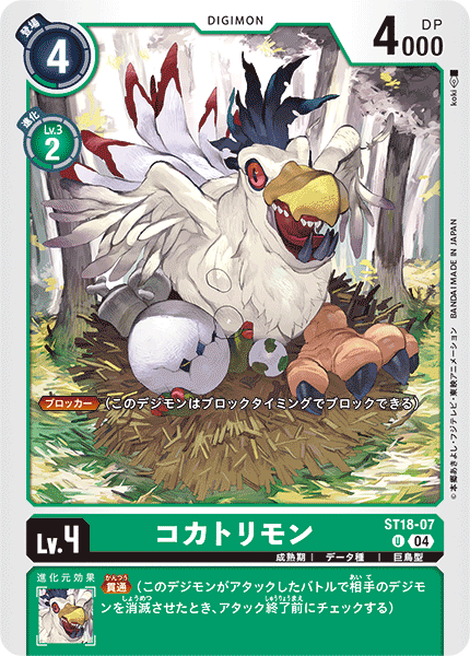 Lv.4 コカトリモン ST18-07 U 成熟期 | データ種 | 巨鳥型 ≪ブロッカー≫(このデジモンはブロックタイミングでブロックできる) --- ≪貫通≫(このデジモンがアタックしたバトルで相手のデジモンを消滅させたとき、アタック終了前にチェックする)