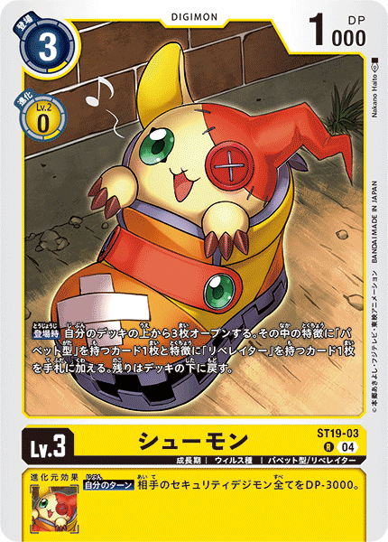 Lv.3 シューモン ST19-03 R 成長期 | ウィルス種 | パペット型/リベレイター 【登場時】自分のデッキの上から3枚オープンする。その中の特徴に「パペット型」を持つカード1枚と特徴に「リベレイター」を持つカード1枚を手札に加える。残りはデッキの下に戻す。 --- 【自分のターン】相手のセキュリティデジモン全てをDP-3000。