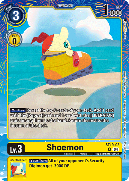 Lv.3 Shoemon ST19-03 R rookie | Virus | Puppet/LIBERATOR [On Play] Reveal the top 3 cards of your deck. Add 1 card with the [Puppet] trait and 1 card with the [LIBERATOR] trait among them to the hand. Return the rest to the bottom of the deck. --- [Your Turn] All of your opponent's security Digimon get -3000 DP.