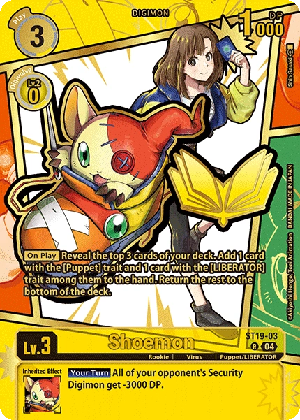 Lv.3 Shoemon ST19-03 R Rookie | Virus | Puppet/LIBERATOR [On Play] Reveal the top 3 cards of your deck. Add 1 card with the [Puppet] trait and 1 card with the [LIBERATOR] trait among them to the hand. Return the rest to the bottom of the deck. --- [Your Turn] All of your opponent's Security Digimon get -3000 DP.