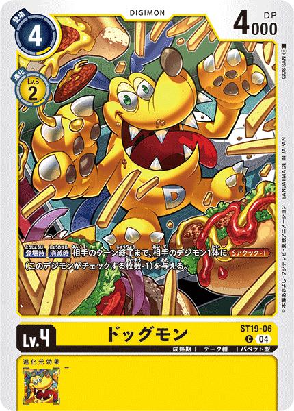 Lv.4 ドッグモン ST19-06 C 成熟期 | データ種 | パペット型 【登場時】【消滅時】相手のターン終了まで、相手のデジモン1体に≪Sアタック-1≫(このデジモンがチェックする枚数-1)を与える。 ---