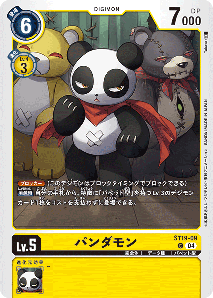 Lv.5 パンダモン ST19-09 C 完全体 | データ種 | パペット型 ≪ブロッカー≫(このデジモンはブロックタイミングでブロックできる) 【消滅時】自分の手札から、特徴に「パペット型」を持つLv.3のデジモンカード1枚をコストを支払わずに登場できる。 ---