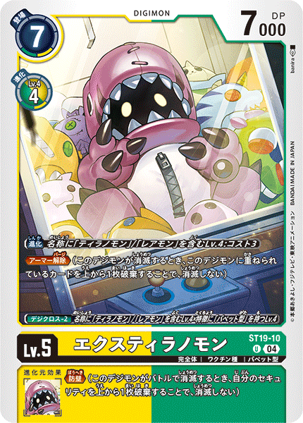 Lv.5 ExTyrannomon ST19-10 U ultimate | Vaccine | Puppet [Digivolve] Lv.4 w/[Tyrannomon]/[Raremon] in name: Cost 3 <Armor Purge> DigiXros -2: Lv.4 w/[Tyrannomon] or [text=] in its name/[Raremon] in name x Lv.4 w/[Puppet] trait --- <Barrier>