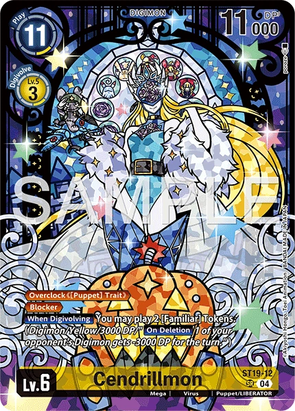 Lv.6 Cendrillmon ST19-12 SR Mega | Virus | Puppet/LIBERATOR <Overclock ([Puppet] Trait)> (At the end of your turn, by deleting 1 of your Tokens or other [Puppet] trait Digimon, this Digimon may attack a player without suspending.) <Blocker> (This Digimon can block in the blocker timing.) [When Digivolving] You may play 2 [Familiar] Tokens. (Digimon/Yellow/3000 DP/"[On Deletion] 1 of your opponent's Digimon gets -3000 DP for the turn.") ---