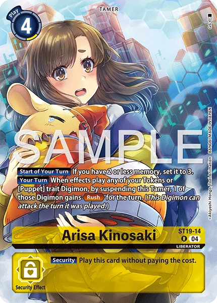 Arisa Kinosaki ST19-14 R LIBERATOR [Start of Your Turn] If you have 2 or less memory, set it to 3. [Your Turn] When effects play one of your Tokens or a Digimon with the [Puppet] trait, by suspending this Tamer, 1 of those Digimon gains <Rush> for the turn. --- [Security] Play this card without paying the cost.