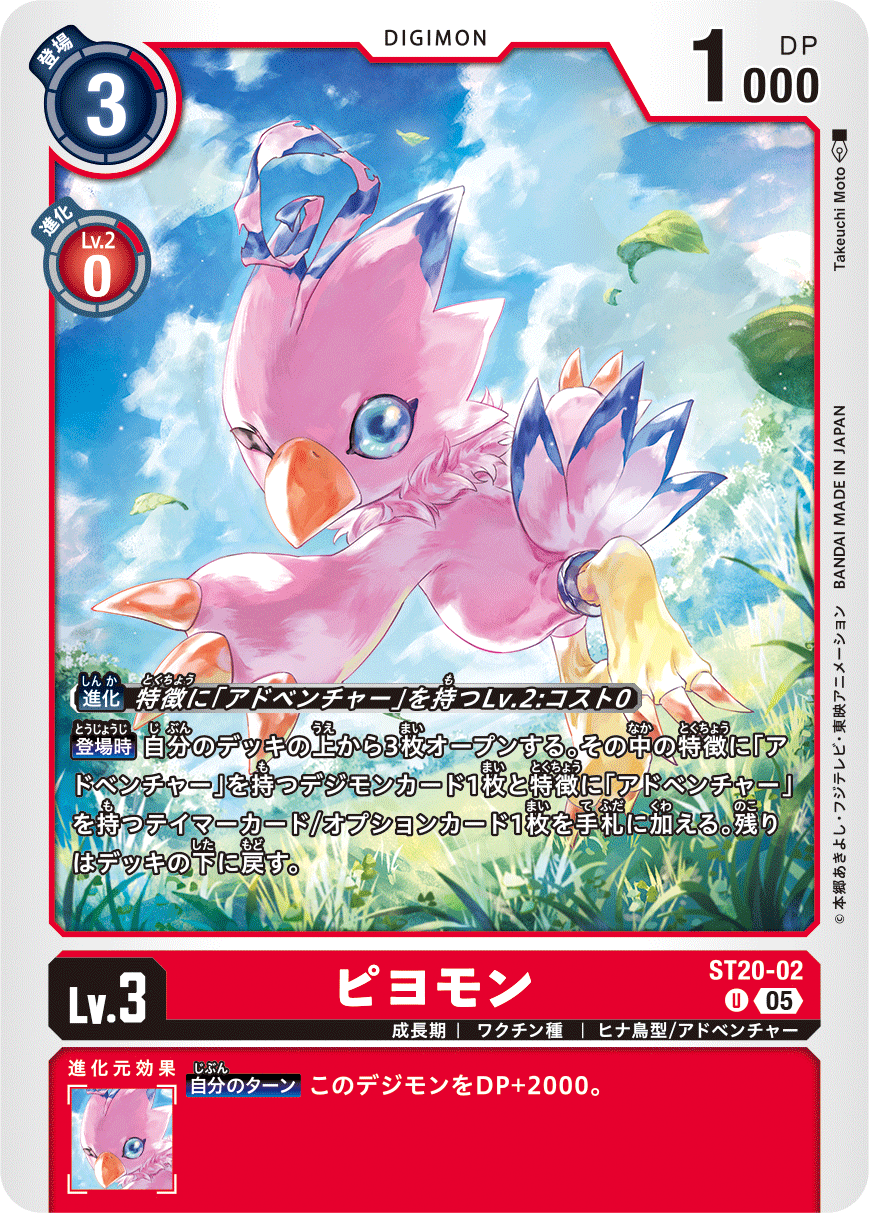 Lv.3 ピヨモン ST20-02 U 成長期 | ワクチン種 | ヒナ鳥型/アドベンチャー 【登場時】自分のデッキの上から3枚オープンする。その中の特徴に「アドベンチャー」を持つデジモンカード1枚と特徴に「アドベンチャー」を持つテイマーカード/オプションカード1枚を手札に加える。残りはデッキの下に戻す。 --- 【自分のターン】このデジモンをDP+2000。
