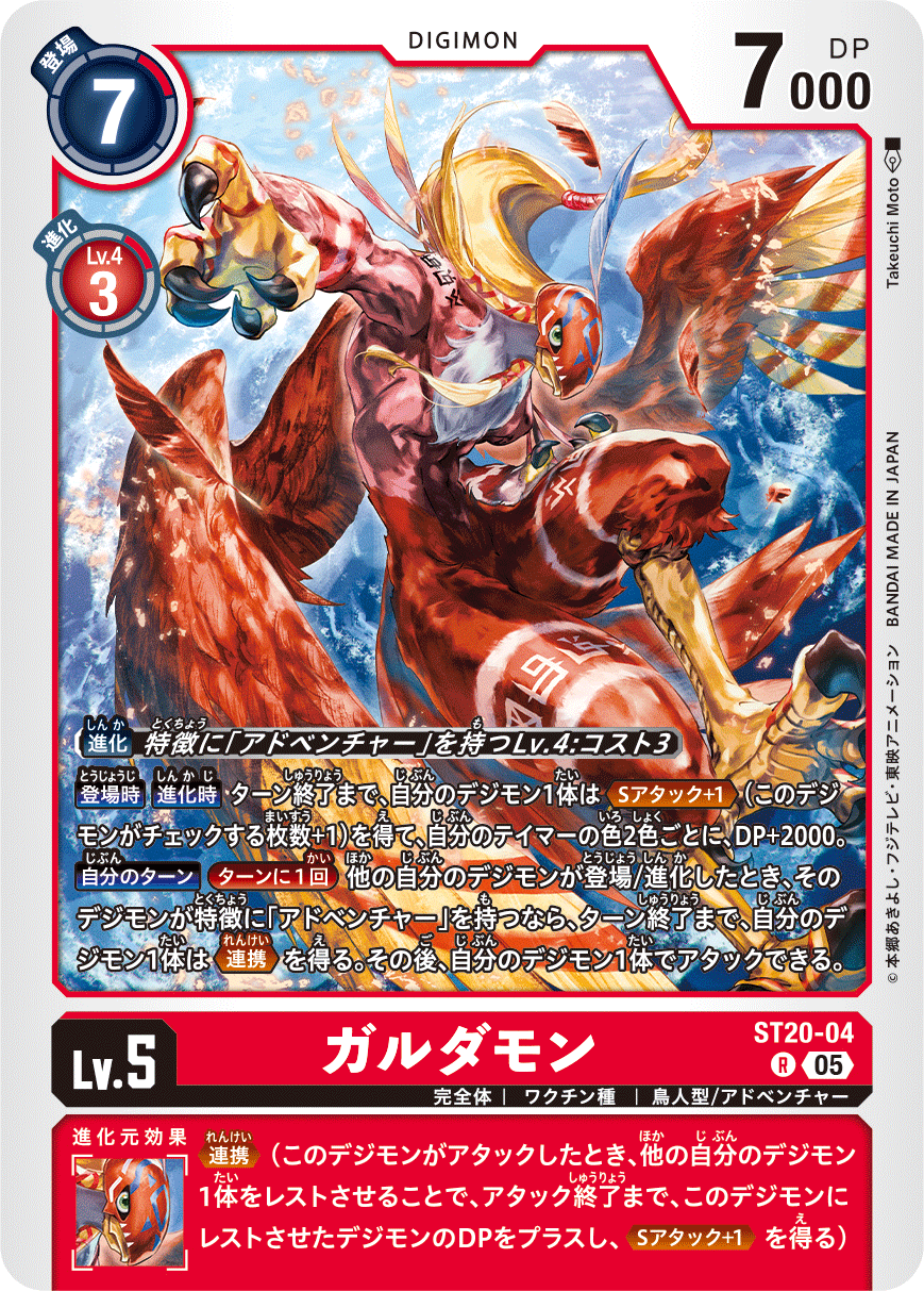 Lv.5 ガルダモン ST20-04 R 完全体 | ワクチン種 | 鳥人型/アドベンチャー 【登場時】【進化時】ターン終了まで、自分のデジモン1体は≪Sアタック+1≫(このデジモンがチェックする枚数+1)を得て、自分のテイマーの色2色ごとに、DP+2000。 【自分のターン】[ターンに1回]他の自分のデジモンが登場/進化したとき、そのデジモンが特徴に「アドベンチャー」を持つなら、ターン終了まで、自分のデジモン1体は≪連携≫を得る。その後、自分のデジモン1体でアタックできる。 --- ≪連携≫(このデジモンがアタックしたとき、他の自分のデジモン1体をレストさせることで、アタック終了まで、このデジモンにレストさせたデジモンのDPをプラスし、≪Sアタック+1≫を得る)