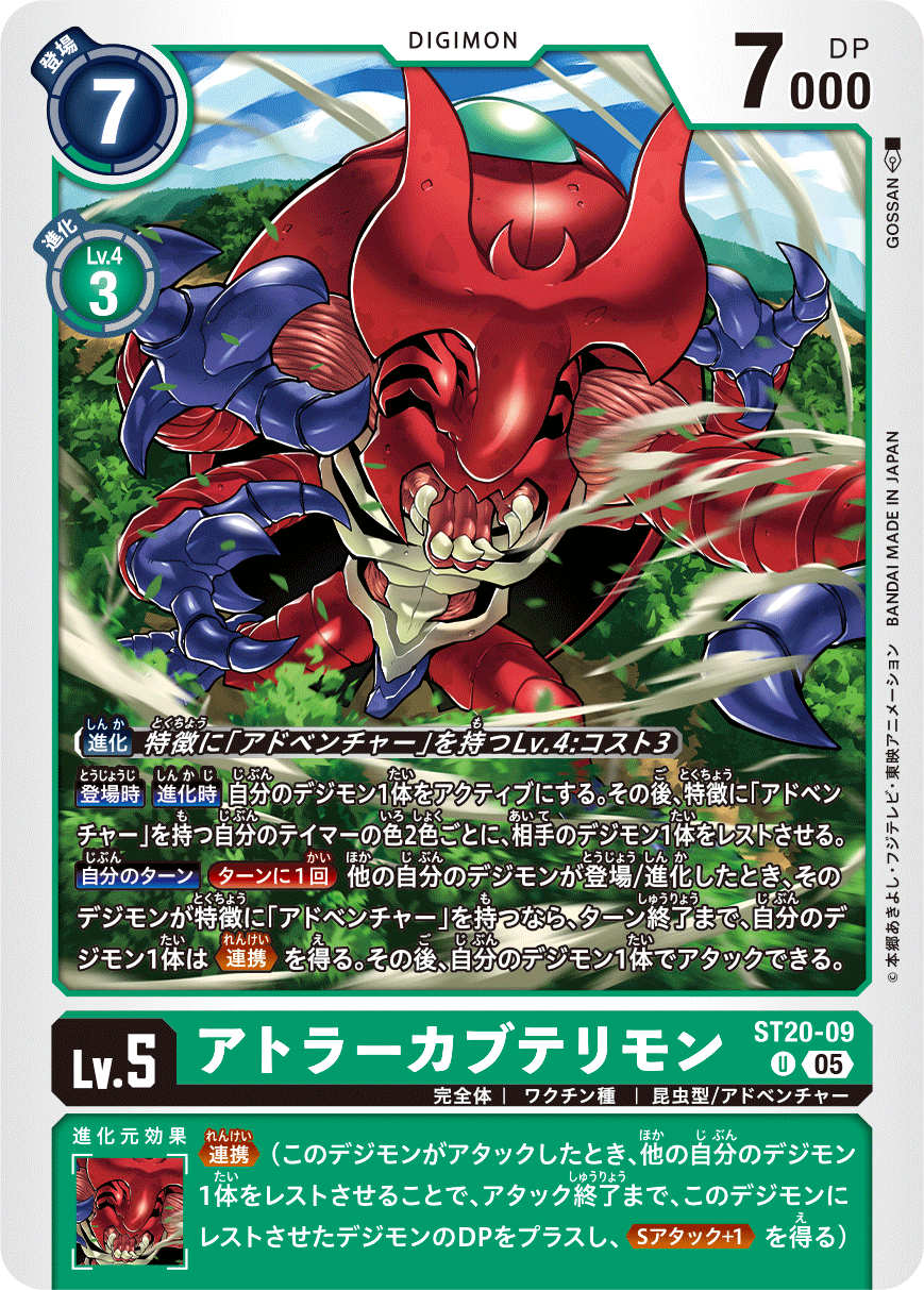 Lv.5 アトラーカブテリモン ST20-09 U 完全体 | ワクチン種 | 昆虫型/アドベンチャー 【登場時】【進化時】自分のデジモン1体をアクティブにする。その後、特徴に「アドベンチャー」を持つ自分のテイマーの色2色ごとに、相手のデジモン1体をレストさせる。 【自分のターン】[ターンに1回]他の自分のデジモンが登場/進化したとき、そのデジモンが特徴に「アドベンチャー」を持つなら、ターン終了まで、自分のデジモン1体は≪連携≫を得る。その後、自分のデジモン1体でアタックできる。 --- ≪連携≫(このデジモンがアタックしたとき、他の自分のデジモン1体をレストさせることで、アタック終了まで、このデジモンにレストさせたデジモンのDPをプラスし、≪Sアタック+1≫を得る)