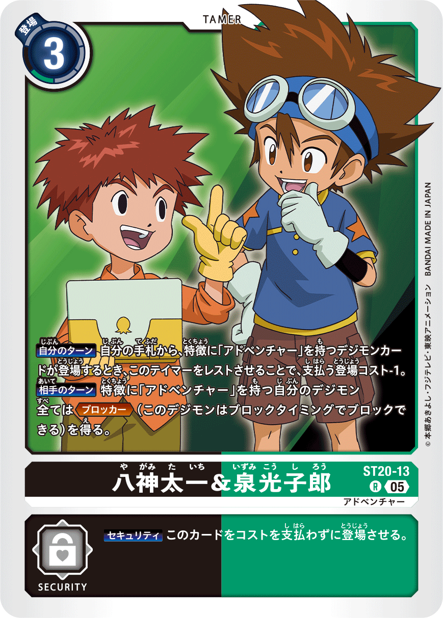 八神太一&泉光子郎 ST20-13 R アドベンチャー 【自分のターン】自分の手札から、特徴に「アドベンチャー」を持つデジモンカードが登場するとき、このテイマーをレストさせることで、支払う登場コスト-1。 【相手のターン】特徴に「アドベンチャー」を持つ自分のデジモン全ては≪ブロッカー≫(このデジモンはブロックタイミングでブロックできる)を得る。 --- 【セキュリティ】このカードをコストを支払わずに登場させる。