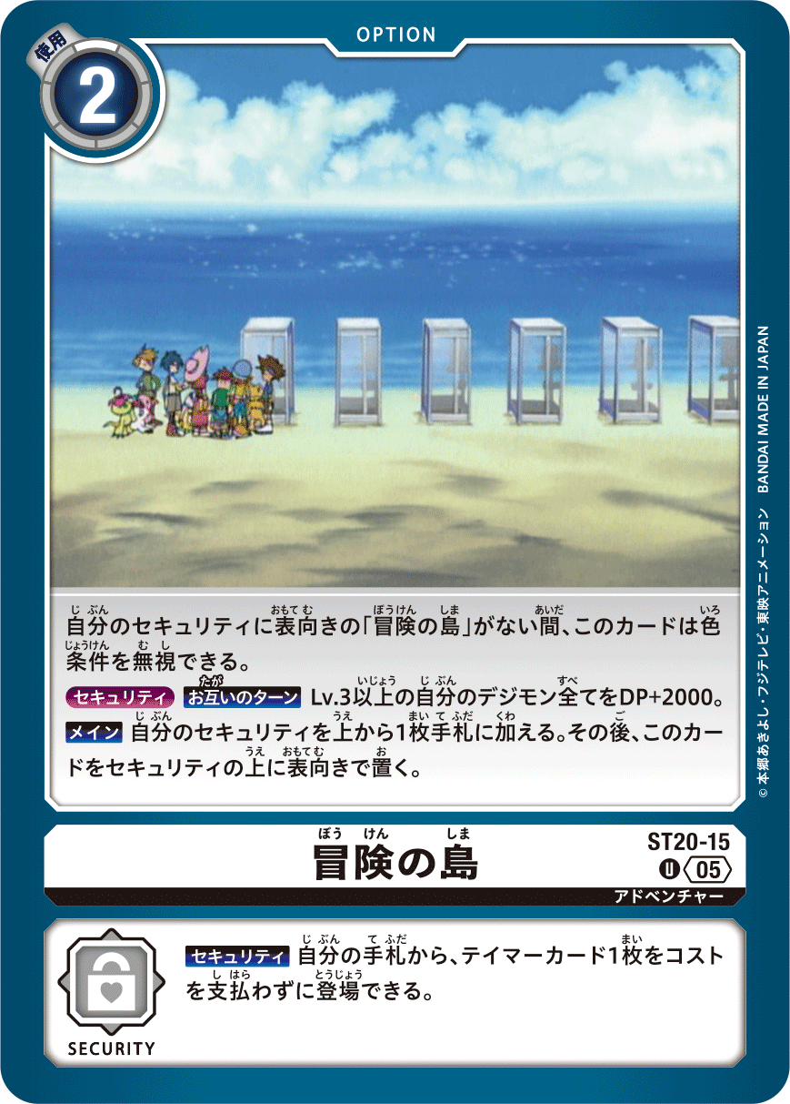 Island of Adventure ST20-15 U ADVENTURE While you have no face-up [Island of Adventure] security cards, you can ignore this card's color requirements. (Security) [All Turns] All of your level 3 or higher Digimon get +2000 DP. [Main] Add your top security card to the hand. Then, place this card face up as the top security card. --- [Security] You may play 1 Tamer card from your hand without paying the cost.