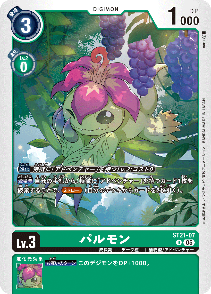 Lv.3 パルモン ST21-07 U 成長期 | データ種 | 植物型/アドベンチャー 【登場時】自分の手札から、特徴に「アドベンチャー」を持つカード1枚を破棄することで、≪2ドロー≫(自分のデッキからカードを2枚引く)。 --- 【お互いのターン】このデジモンをDP+1000。