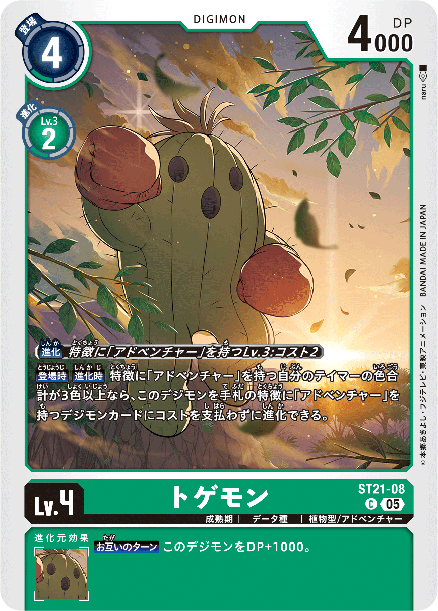 Lv.4 トゲモン ST21-08 C 成熟期 | データ種 | 植物型/アドベンチャー 【登場時】【進化時】特徴に「アドベンチャー」を持つ自分のテイマーの色合計が3色以上なら、このデジモンを手札の特徴に「アドベンチャー」を持つデジモンカードにコストを支払わずに進化できる。 --- 【お互いのターン】このデジモンをDP+1000。