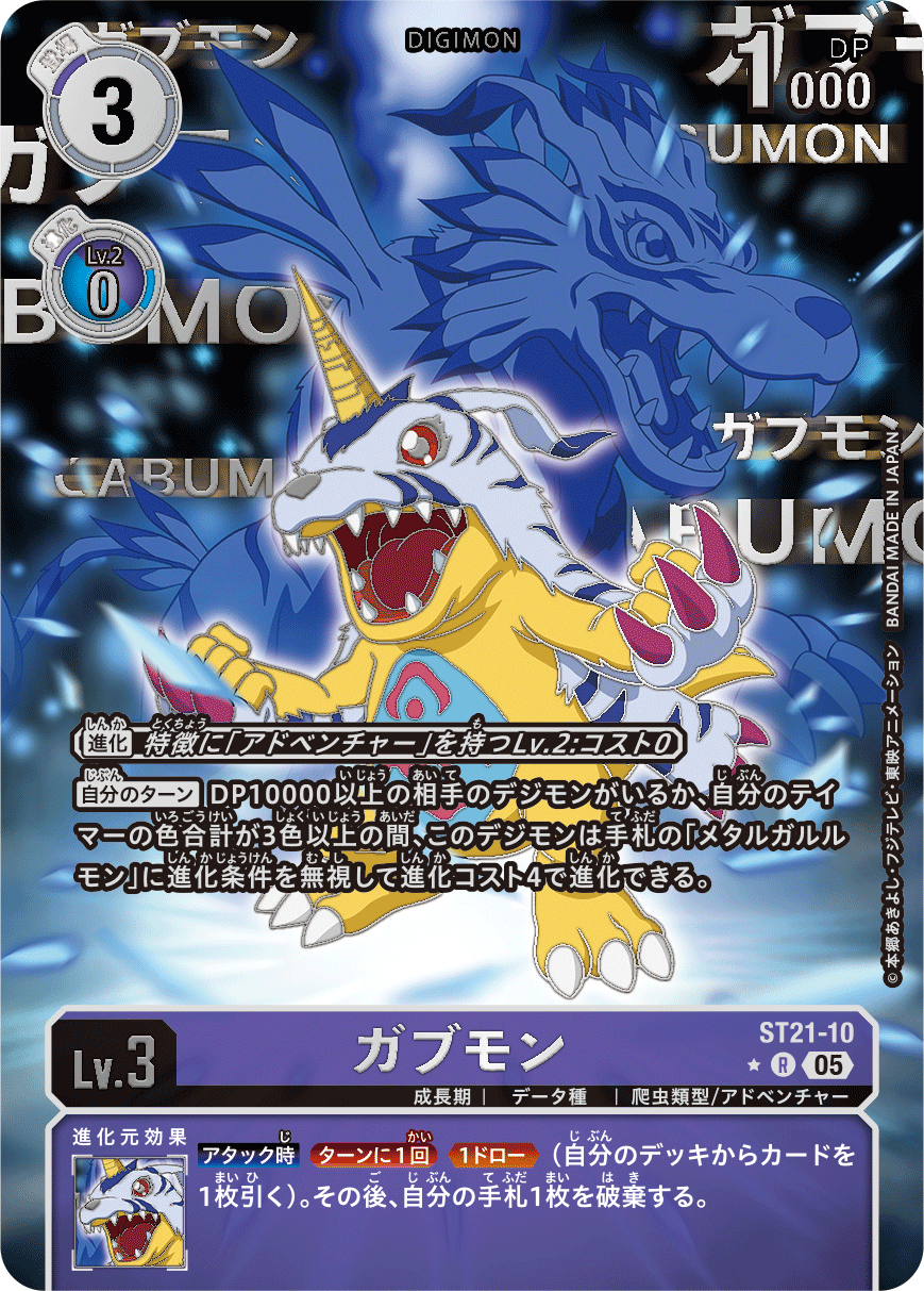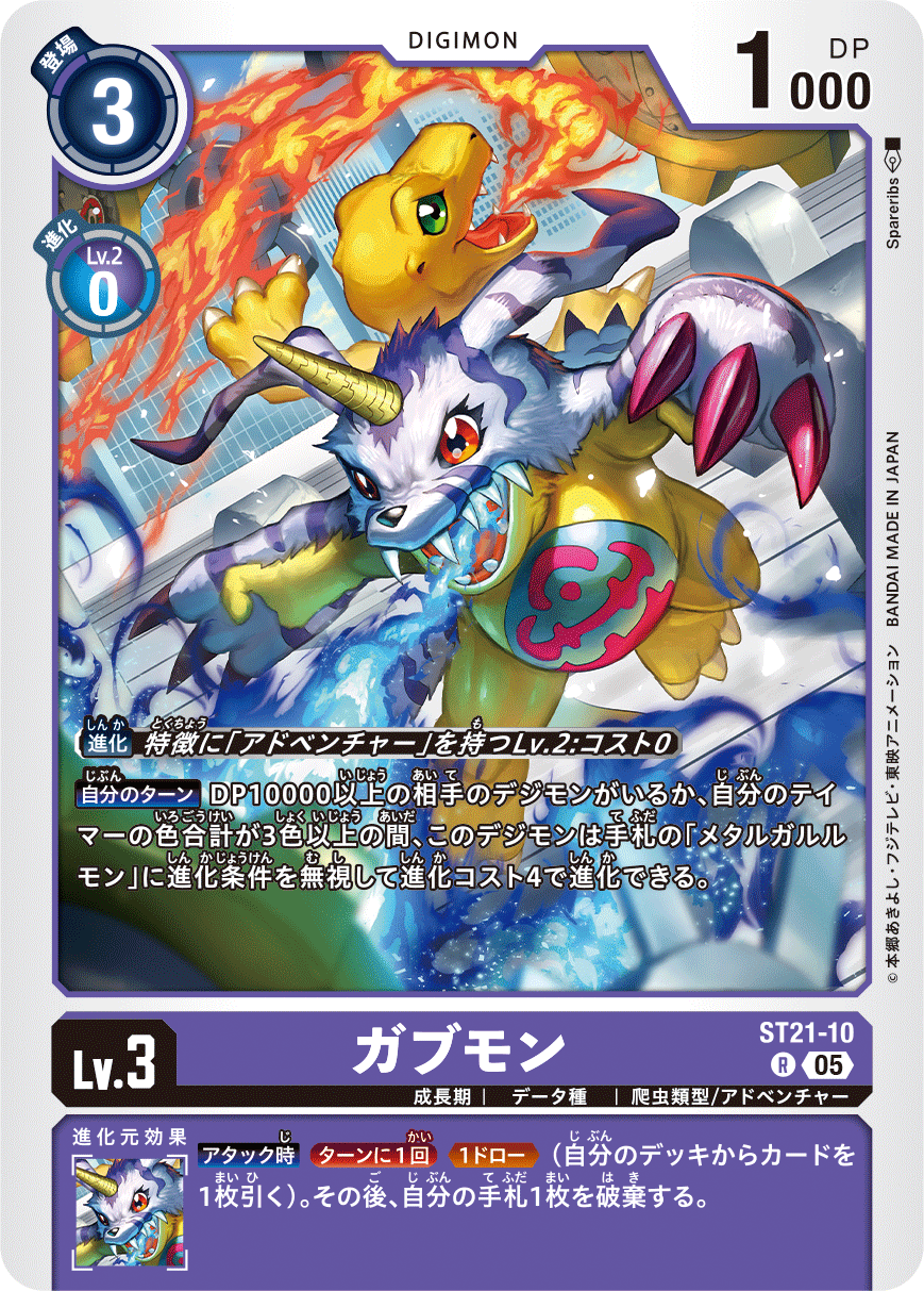 Lv.3 ガブモン ST21-10 R 成長期 | データ種 | 爬虫類型/アドベンチャー 【自分のターン】DP10000以上の相手のデジモンがいるか、自分のテイマーの色合計が3色以上の間、このデジモンは手札の「メタルガルルモン」に進化条件を無視して進化コスト4で進化できる。 --- 【アタック時】[ターンに1回]≪1ドロー≫(自分のデッキからカードを1枚引く)。その後、自分の手札1枚を破棄する。