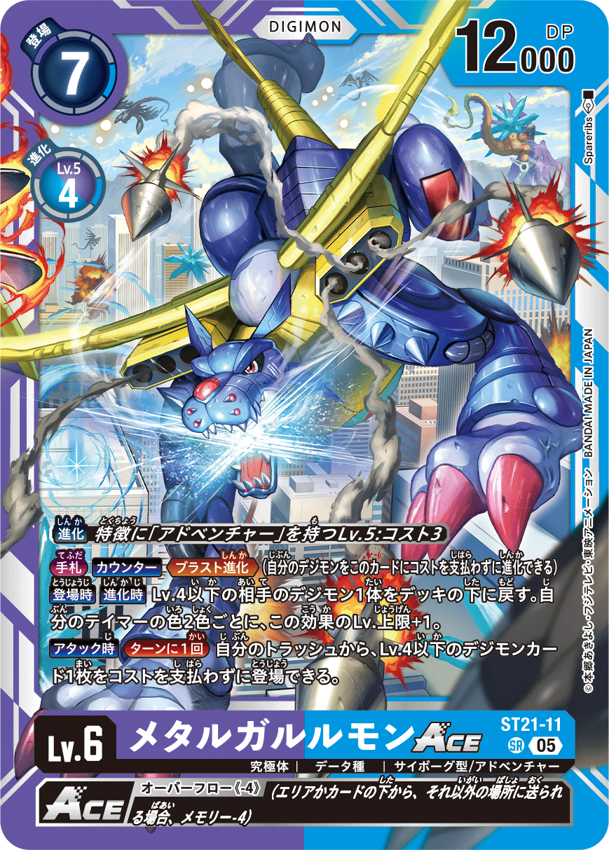 Lv.6 MetalGarurumon ACE ST21-11 SR mega | Data | Cyborg/ADVENTURE [Digivolve] Lv.5 w/[ADVENTURE] trait: Cost 3 [Hand] [Counter] <Blast Digivolve> (One of your Digimon may digivolve into this card without paying the cost.) [On Play] [When Digivolving] Return 1 of your opponent's level 4 or lower Digimon to the bottom of the deck. For every 2 colors your Tamers have, add 1 to this effect's level maximum. [When Attacking] [Once Per Turn] You may play 1 level 4 or lower Digimon card from your trash without paying the cost. --- <Overflow (-4)> (As this card moves from the battle area or under a card to another area, lose 4 memory.)
