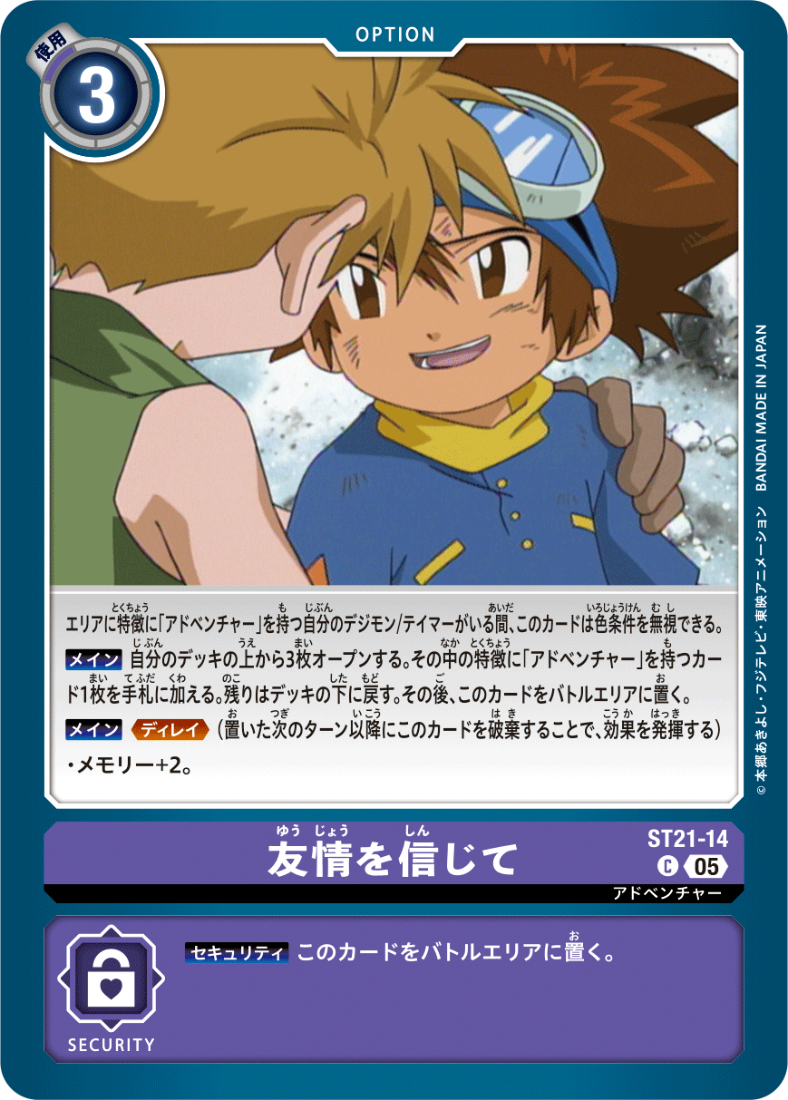 友情を信じて ST21-14 C アドベンチャー エリアに特徴に「アドベンチャー」を持つ自分のデジモン/テイマーがいる間、このカードは色条件を無視できる。 【メイン】自分のデッキの上から3枚オープンする。その中の特徴に「アドベンチャー」を持つカード1枚を手札に加える。残りはデッキの下に戻す。その後、このカードをバトルエリアに置く。 【メイン】≪ディレイ≫(置いた次のターン以降にこのカードを破棄することで、効果を発揮する) • メモリー+2。 --- 【セキュリティ】このカードをバトルエリアに置く。