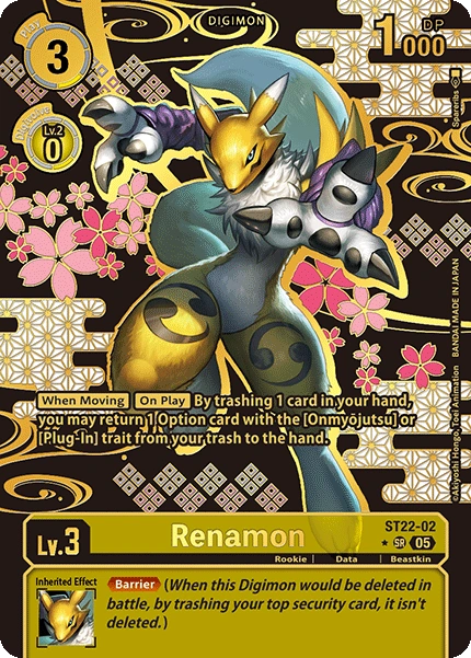 Lv.3 Renamon ST22-02 SR Rookie | Data | Beastkin [When Moving] [On Play] By trashing 1 card in your hand, you may return 1 Option card with the [Onmyōjutsu] or [Plug-In] trait from your trash to the hand. --- <Barrier> (When this Digimon would be deleted in battle, by trashing your top security card, it isn't deleted.)